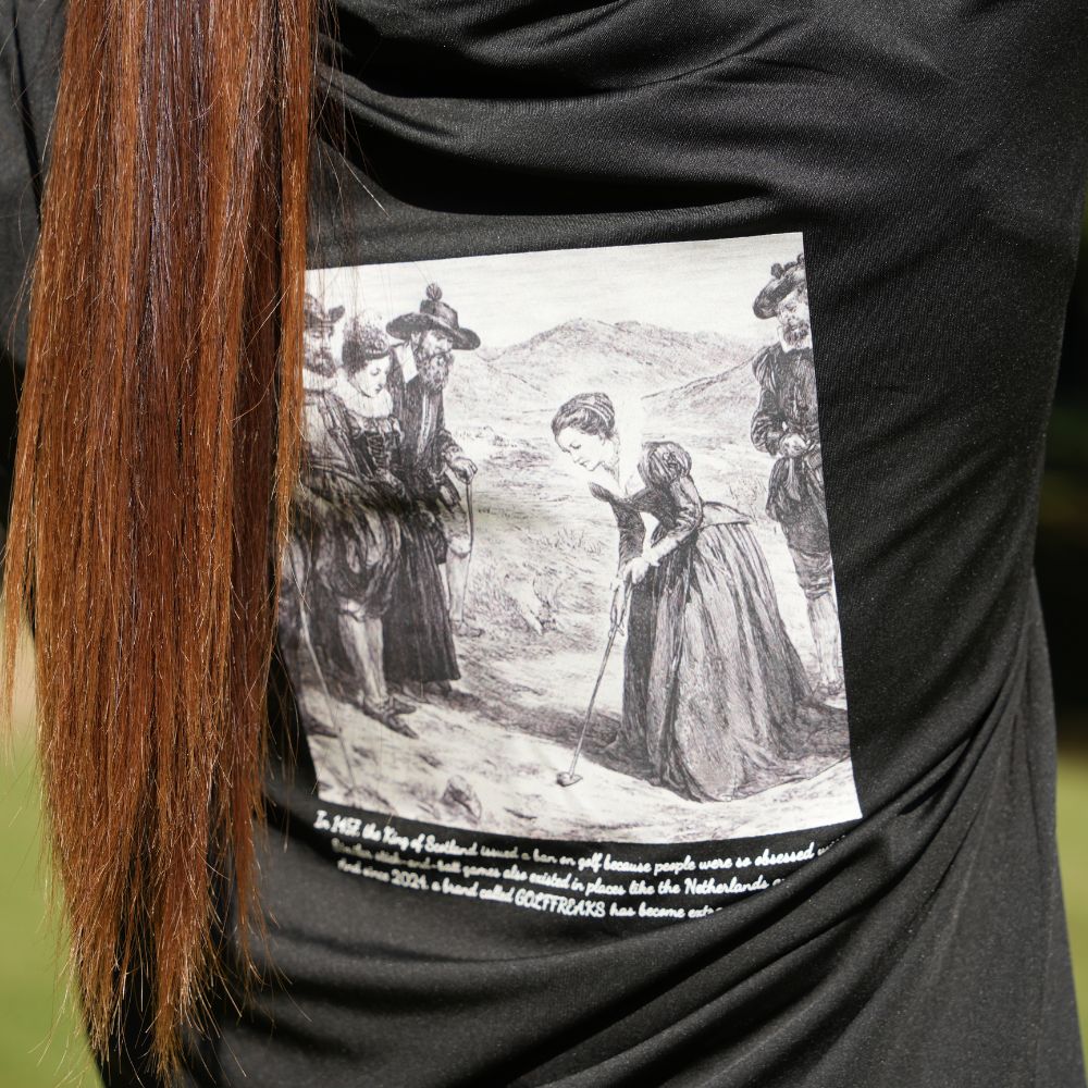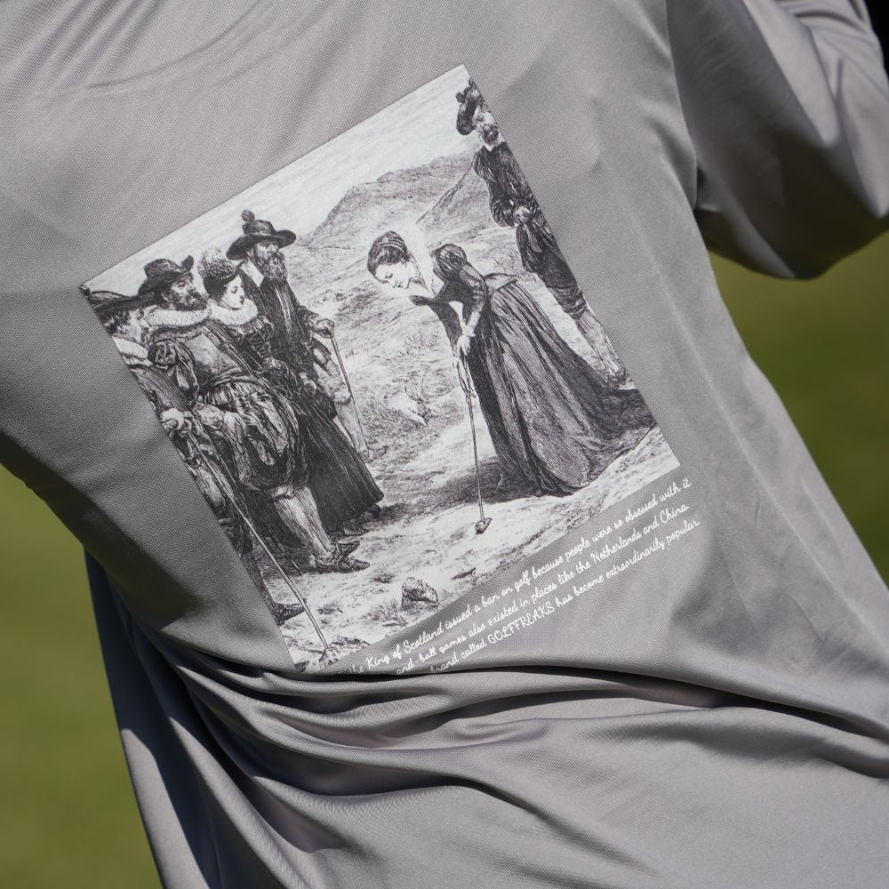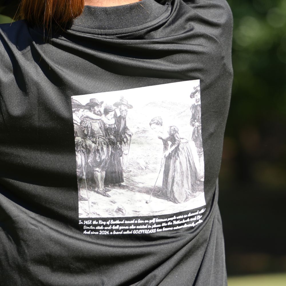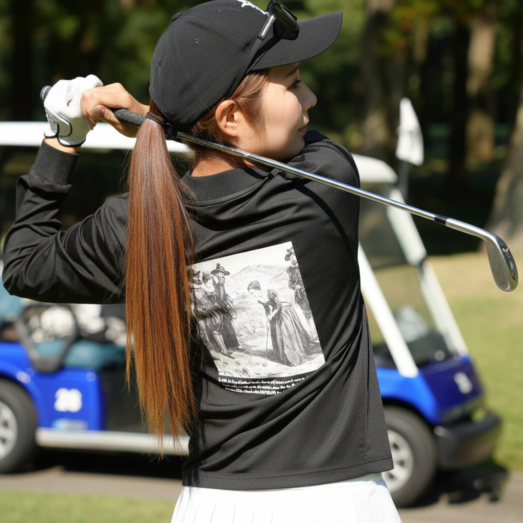 歴史的なゴルフシーンをモチーフにしたアートグラフィックが印象的で、