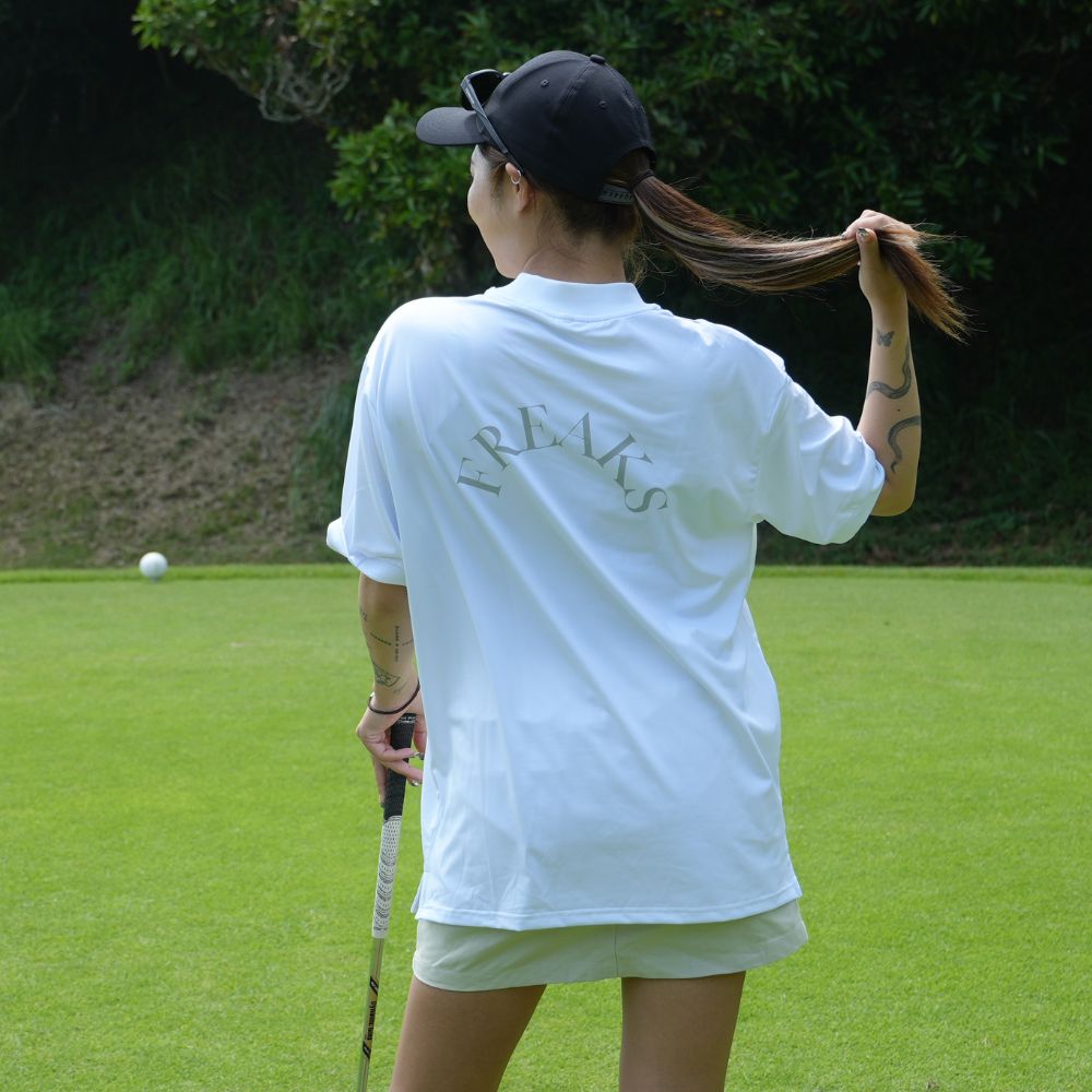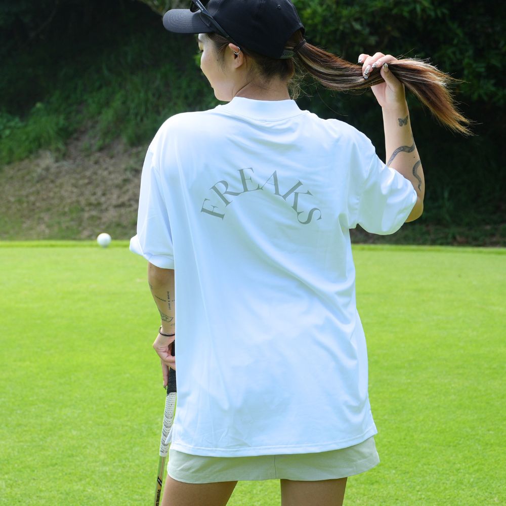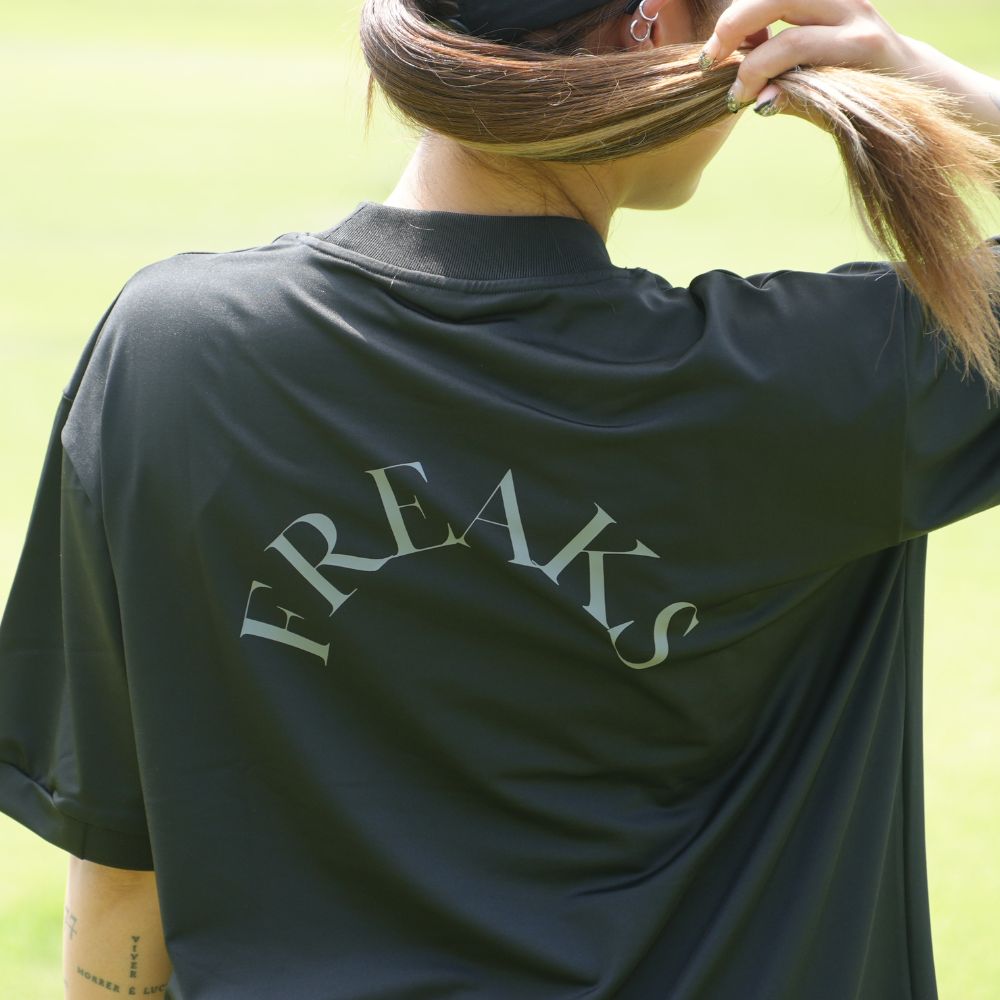 This mock neck shirt has a high collar with the "freaks" logo embroidered in the center of the front and "Zip your lips" printed on the back .