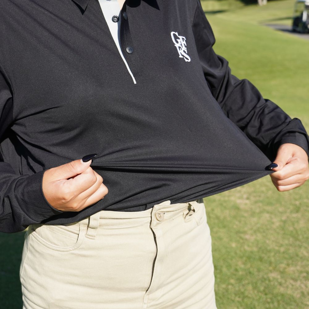 A snap button long sleeve polo shirt made from highly stretchable fabric.