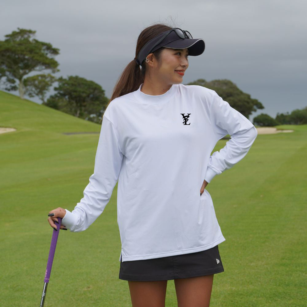 NOPAIN NOGOLFのメッセージが背面に大胆にプリントされた長袖モックネックシャツ。